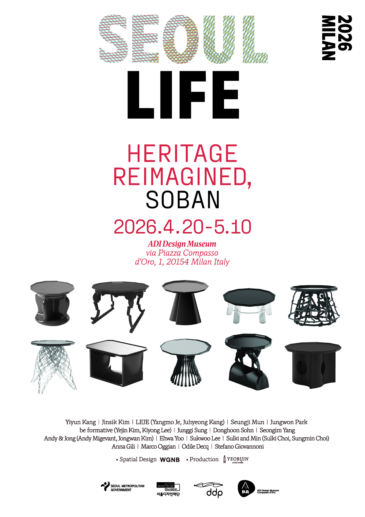 이번 전시는 소반의 본질적 가치를 바탕으로, 국내외 대표 젊은 디자이너 17인(팀)이 3D 프린팅과 AI 기반 디자인 등 현대 기술과 새로운 제작 방식을 결합해 이를 동시대적으로 재해석한 작업을 선보입니다. 디지털 설계, 신소재 실험, 그리고 공예 감각이 결합된 작품들은 전통이 과거에 머무르지 않고 현재와 미래로 확장되는 가능성을 제시하며, 장인의 제작 과정을 통해 완성됨으로써 디자인과 공예가 만나는 지점을 보여주고 한국 디자인의 깊이와 확장성을 함께 제시합니다. 「SEOUL LIFE 2026 MILAN」은 소반이라는 하나의 오브제를 통해 한국의 생활문화가 지닌 본질을 조명하고, 이를 글로벌 디자인 담론 속에서 새롭게 연결하고자 합니다. 과거의 지혜와 현재의 기술, 그리고 미래의 가능성이 교차하는 이 전시는 서울의 삶이 지닌 고유한 가치와 그 확장성을 세계에 제안합니다. □ 전시 개요 ○ 전 시 명 : 서울라이프 2026 밀라노: 전통과 문화기술의 융합 ○ 전시기간 : 2026. 4. 20.(월) ~ 5. 10.(일) ○ 전시장소 : 이탈리아 밀라노 ADI 디자인 뮤지엄 1층 ○ 주최/주관: 서울시 / 서울디자인재단 ○ 협 력 : ADI 디자인 뮤지엄 ○ 개 막 식 : 2026. 4. 20.(월) 16:00 / ADI 디자인 뮤지엄 내 FOYER 공간 □ 참여 디자이너 ○ 국 내 : 강이연, 김진식, 르쥬(제양모, 강주형), 문승지, 박중원, 비포머티브(이기용, 김예진), 성정기, 손동훈, 양성임, 앤디엔종(앤디 미저번트, 김종완), 유이화, 이석우, 슬기와민(최슬기, 최성민) ○ 해 외 : 안나 질리(이탈리아), 마르코 오지안(이탈리아), 오딜 데크(프랑스), 스테파노 지오반노니(이탈리아)