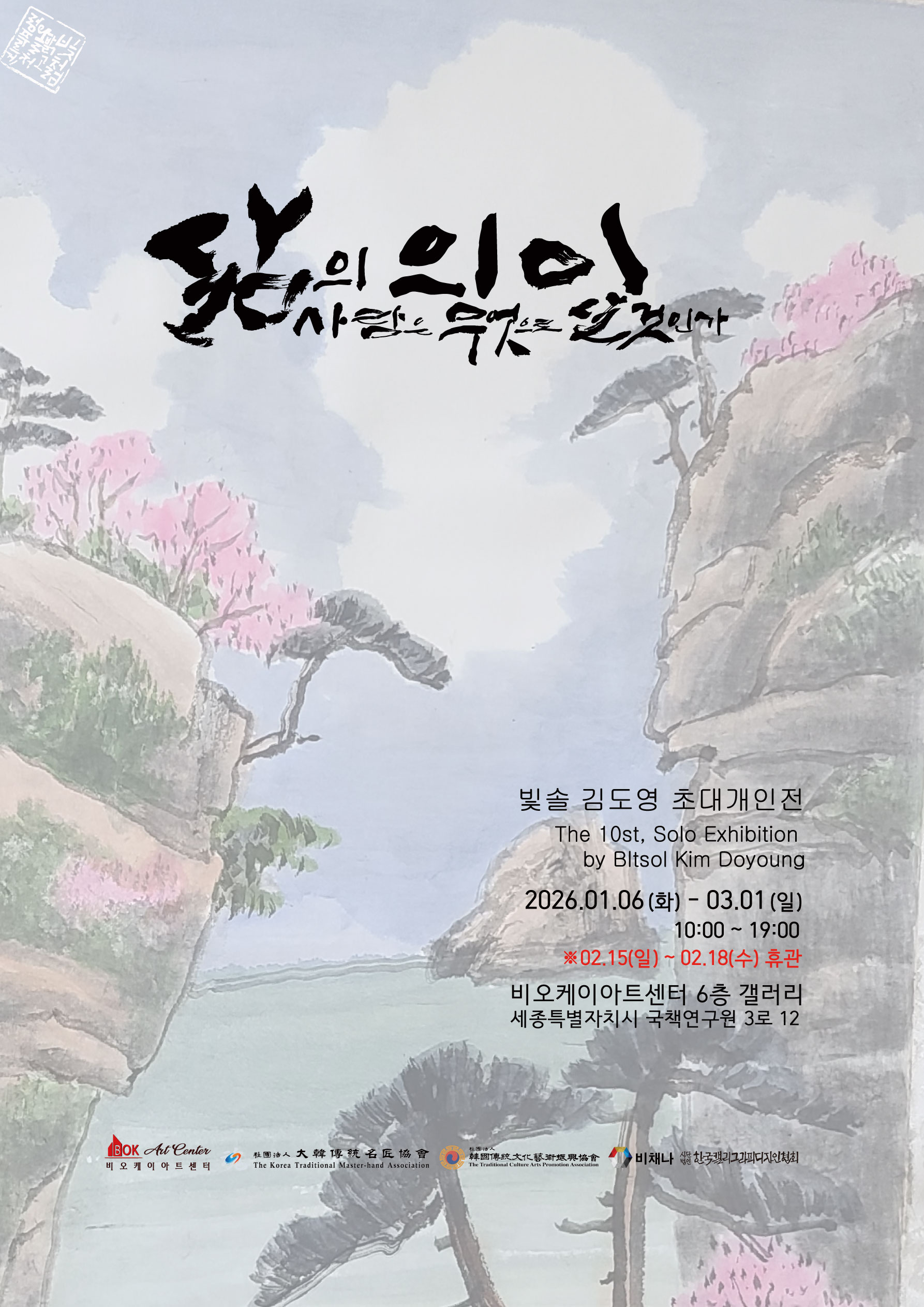 - 일정: 2026.01.06.(화)~2026.03.01.(일) - 장소: 세종시 비오케이아트센터 6층 갤러리 - 주최: 빛솔캘리그라피 - 주관: 빛솔캘리그라피 - 후원: (사)한국캘리그라피디자인협회, (사)비오케이아트센터, (사)한국전통명장협회, (사)한국전통문화예술진흥협회, (사)비채나 KCDIA 네이버 카페 http://cafe.naver.com/kcdia KCDIA 인스타그램 http://www.instagram.com/kcdia2024 KCDIA 페이스북 https://www.facebook.com/kcdia000