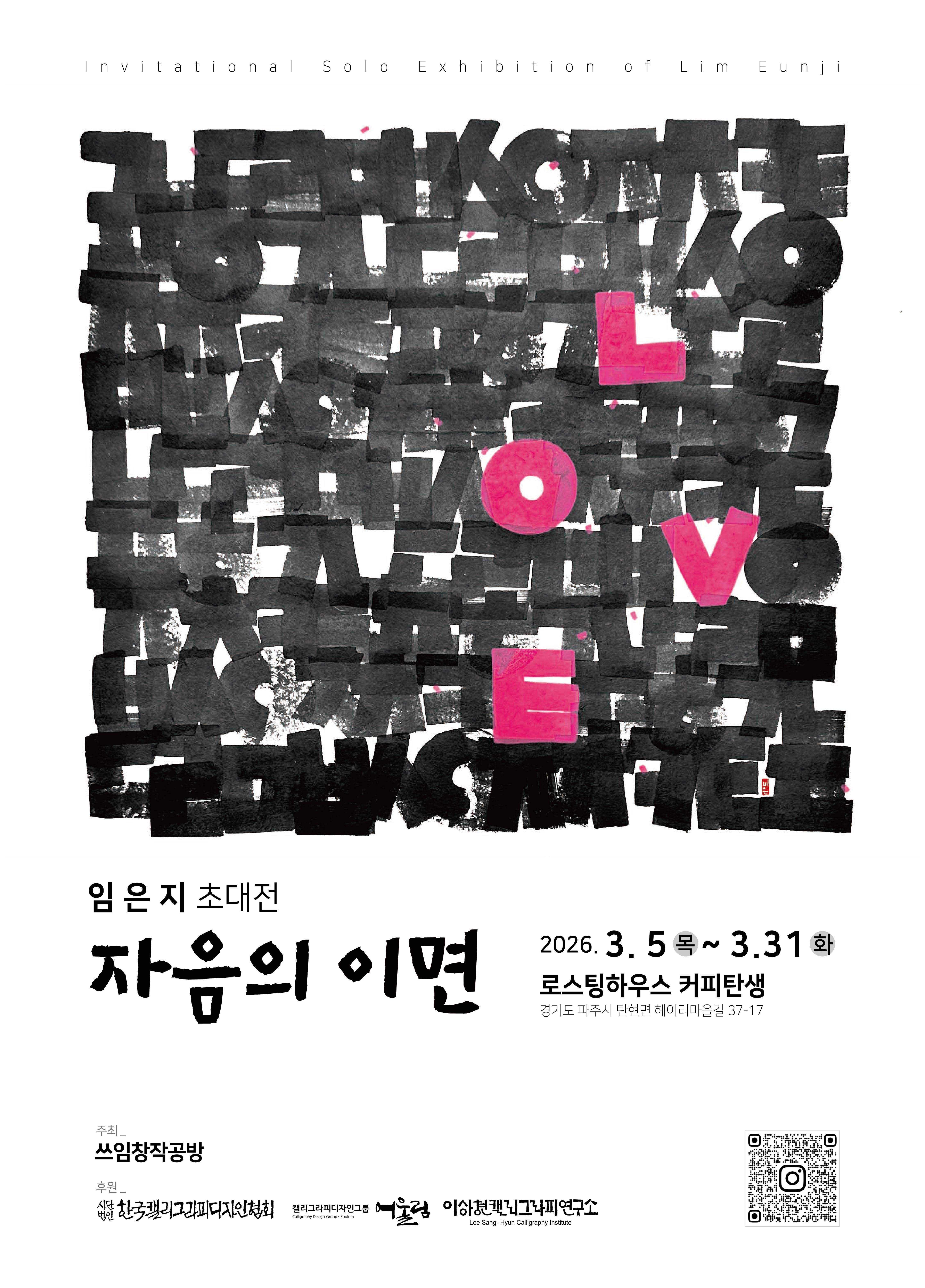 - 일정: 2026.03.05.(목)~2026.03.31.(화) - 장소: 로스팅하우스 커피탄생 - 주최: 쓰임창작공방 - 후원: (사)한국캘리그라피디자인협회, 캘리그라피디자인그룹어울림, 이상현 캘리그라피연구소